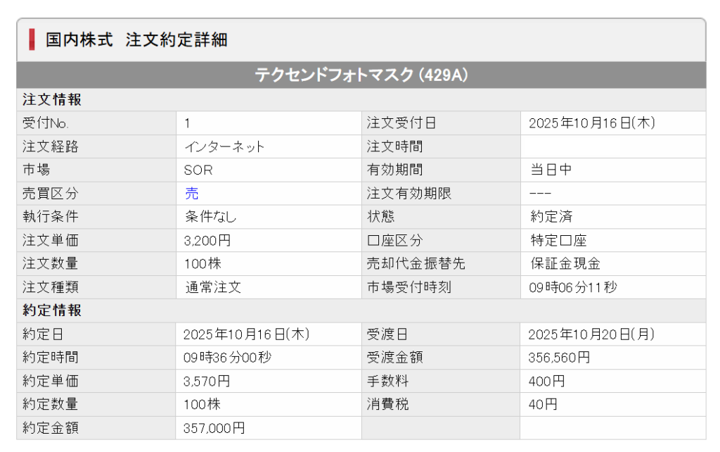 過去記事で当選報告したテクセンドフォトマスク(429A)ですが、こちらは初値で売却して税引き後約45,000円ゲット。