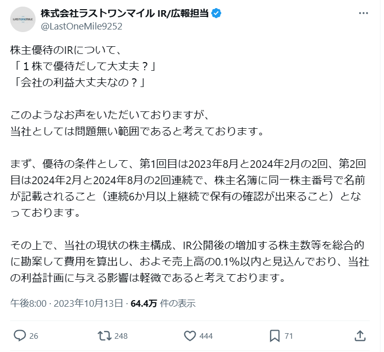1,000株以上が必要と言えど株価は発表日の終値で3桁なので利回りは高いです。