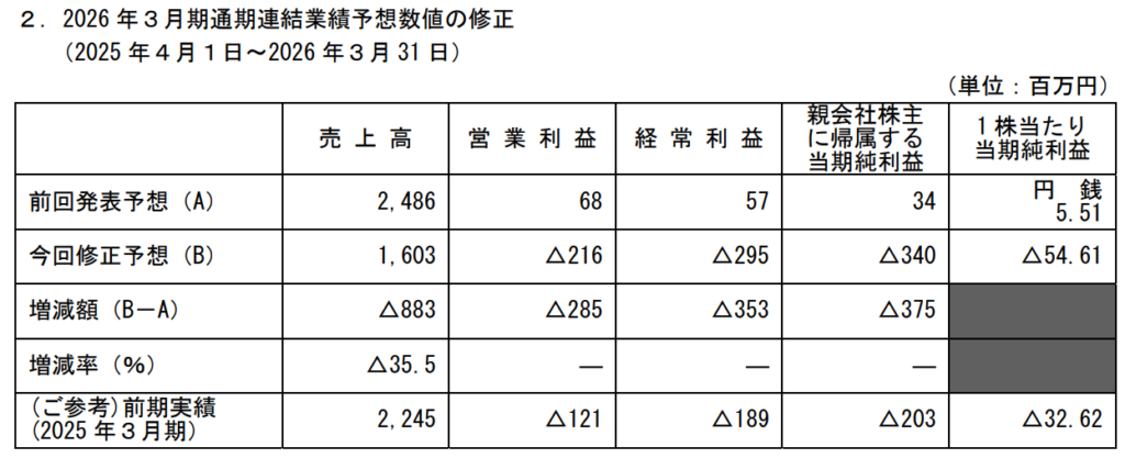 今回の優待改悪に加え、業績不振により配当予想も無配となりました。