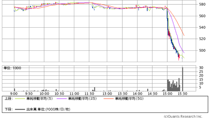 15時にこの適時開示が出てきた後、チャートは右肩下がりに転落。下のチャートは1分足です。