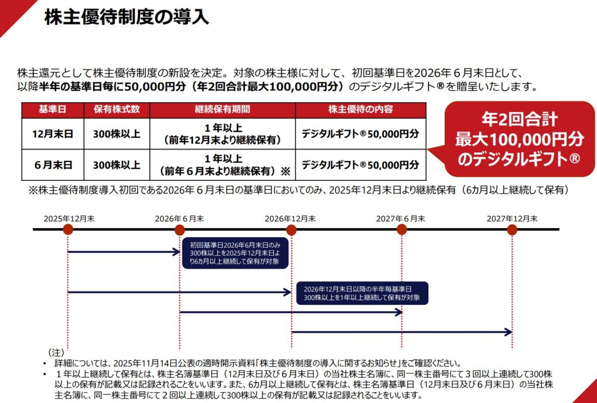 ※ただし、初回である2026年6月末権利のみ、保有期間6ヶ月以上(25年12月より継続保有)で優待が頂けます。