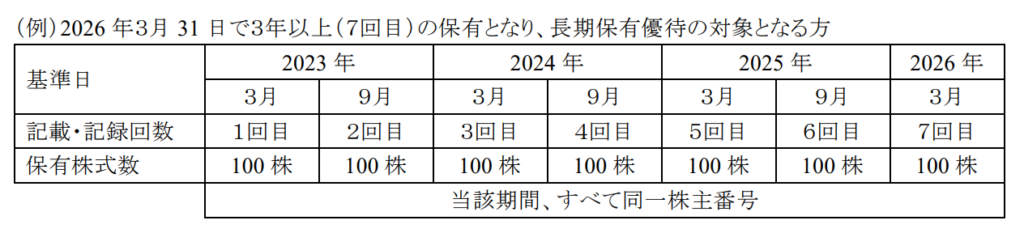 この継続保有の条件は3月末日、9月末日の当社株主名簿に、同一株主番号で、100株以上の保有が7回以上連続して記載または記録されていることにより判定となっています。