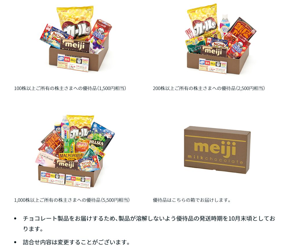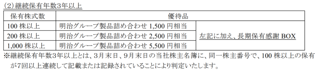 毎年3月末権利、100株以上保有で明治グループ製品詰め合わせの進呈。