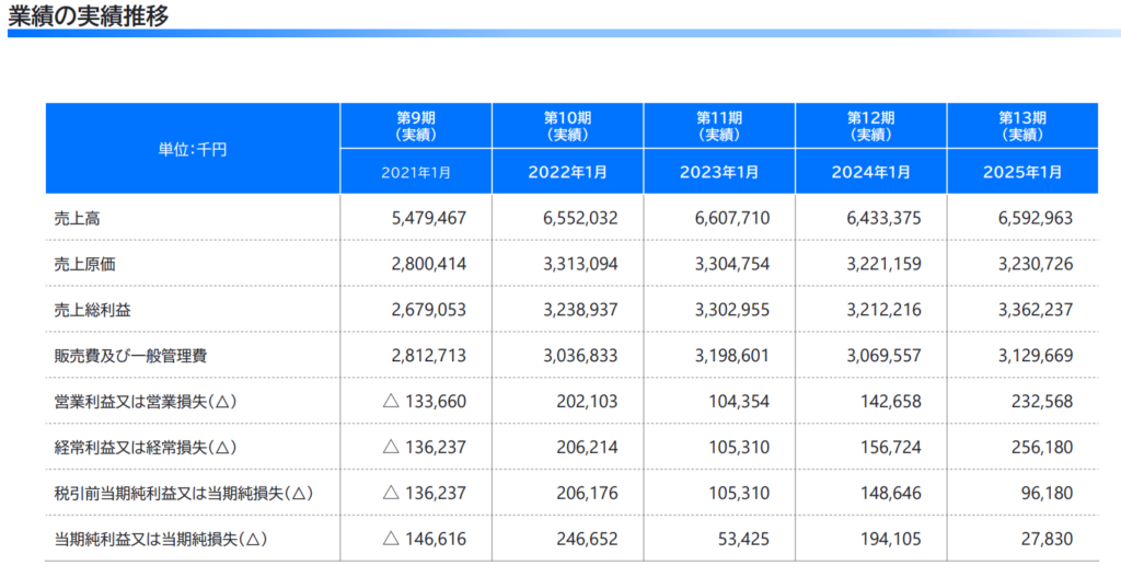 しかし直近5期の業績推移を見ると、2022年1月期以降売上はほぼ横ばいに近いですね~。