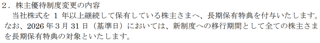 なお、2026年3月権利においては、新制度への移行期間として全株主を長期保有特典の対象にします。とのことです。