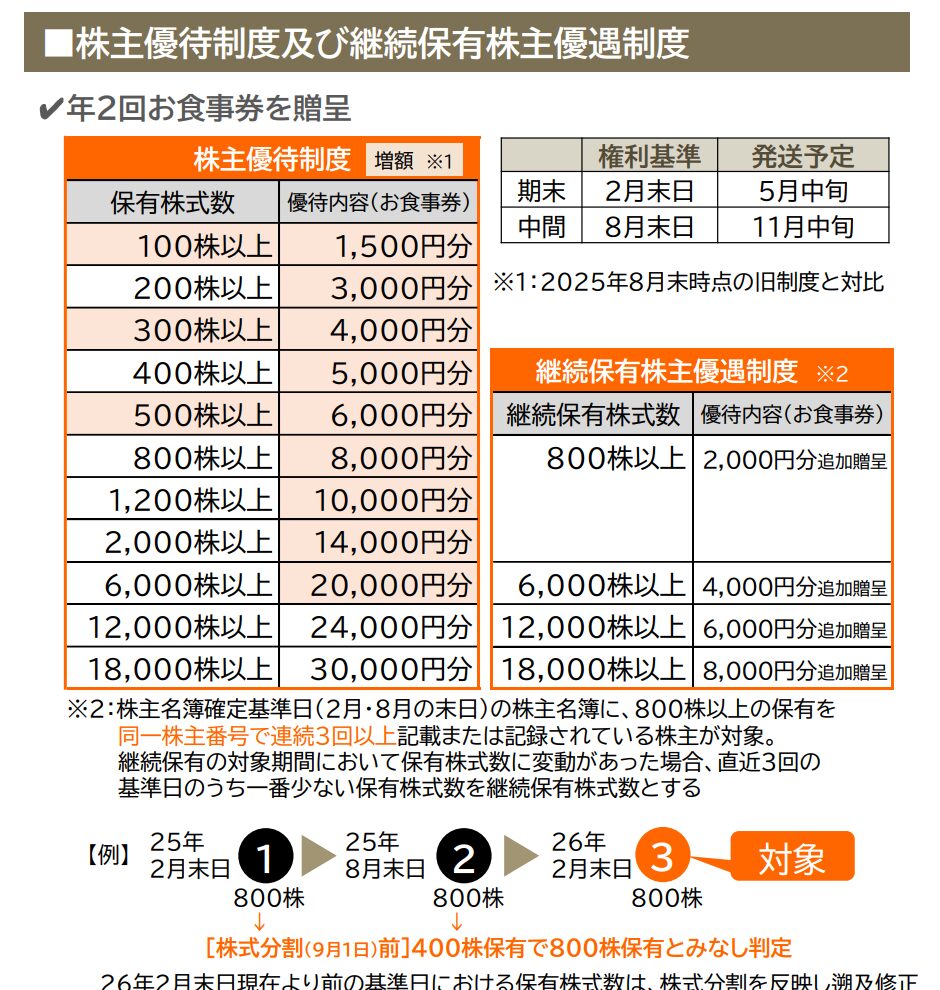 保有株数に応じ食事券を進呈。継続保有でさらに優遇。