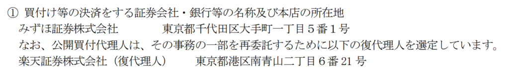 公開買付代理人はみずほ証券、公開買付復代理人は楽天証券となっています。