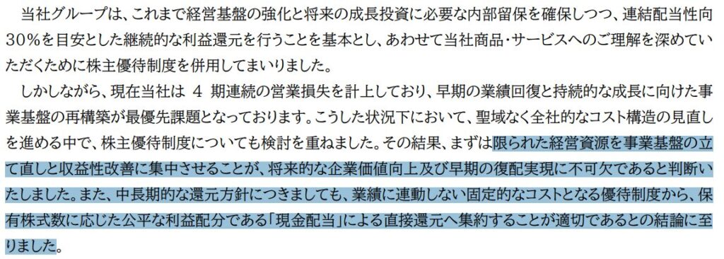 今回の適時開示を見ると「今後の株主還元方針を「配当による直接的な還元」を基本とする方針へと変更し、これに伴い株主優待制度を廃止させていただくことといたしました。」という記載がありました。