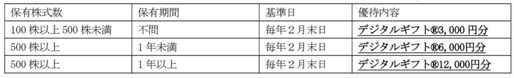 毎年2月権利、保有株数や年数に応じデジタルギフトを3,000円~12,000円を進呈。