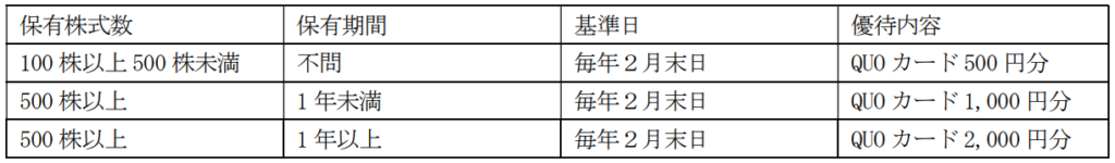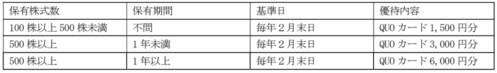発表当時の内容はクオカード。100株保有で500円分です。