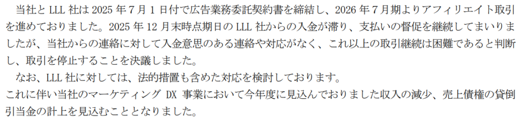 その理由は売上高全体に占める割合が3%を超える「株式会社 LLL」という取引先からの入金が滞った事が大きいようです。