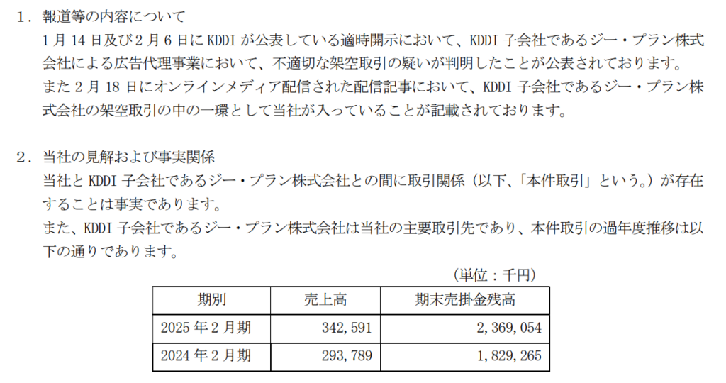 そして主要取引先「ジープラン株式会社(KDDI子会社)」に不適切な架空取引の疑いが出ており、その一環としてバリュークリエーション社が入っているとメディアが配信している模様。