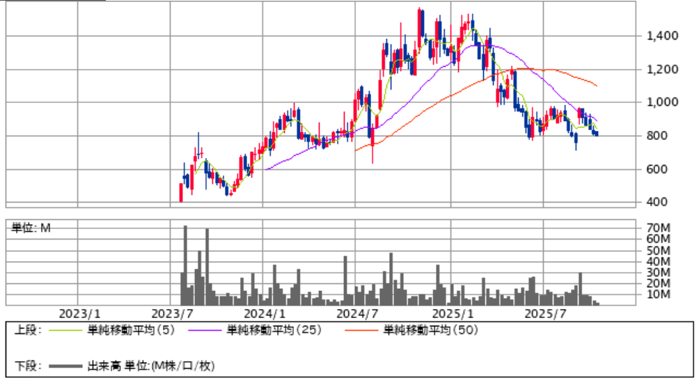 直近の決算で株価が700円台⇒900円以上に上昇したのにまた800円前後まで下がってしまったのです。