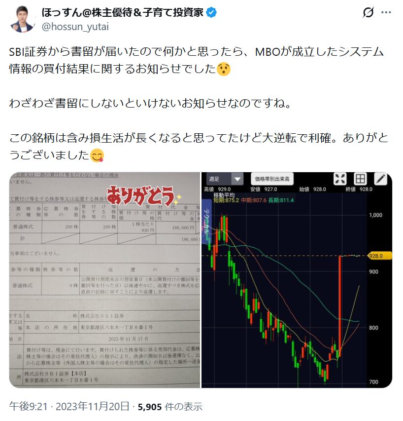 私が保有していたセントケアホールディングがTOB(株式公開買付)になったのでありがたくそれに申し込んだのが理由でした。