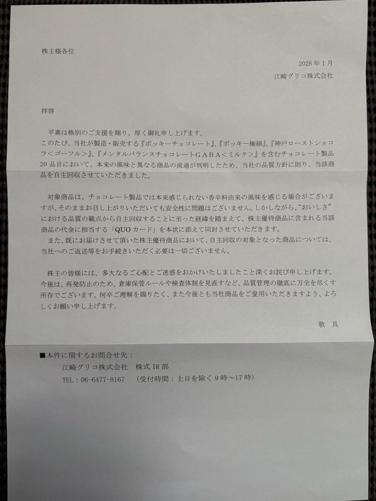 会社としては基準に合っていない商品を出荷してしまったためのお詫びですが、普通に食べてしまった私にとっては隠れ優待のような形になってしまいました。