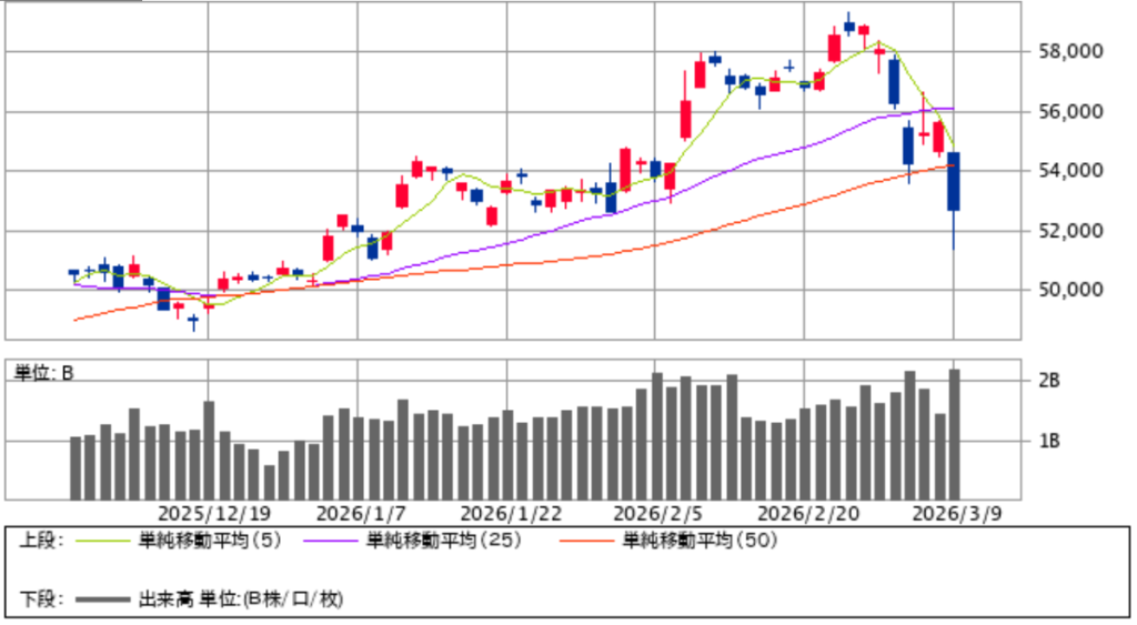 2026年3月9日の日経平均株価は一時前日差でマイナス4,000円を超える展開もありましたが最終的には2,892.12円マイナスの52,728.72円。
