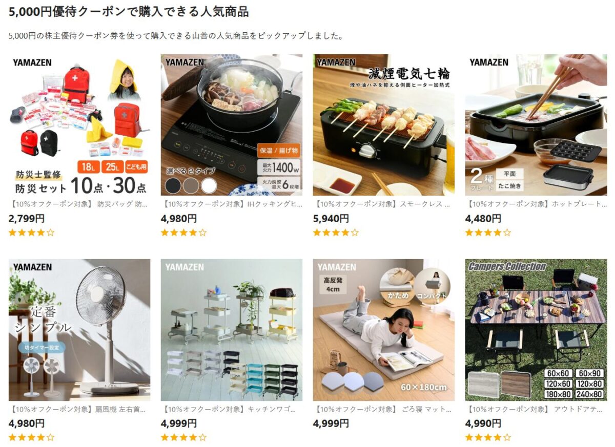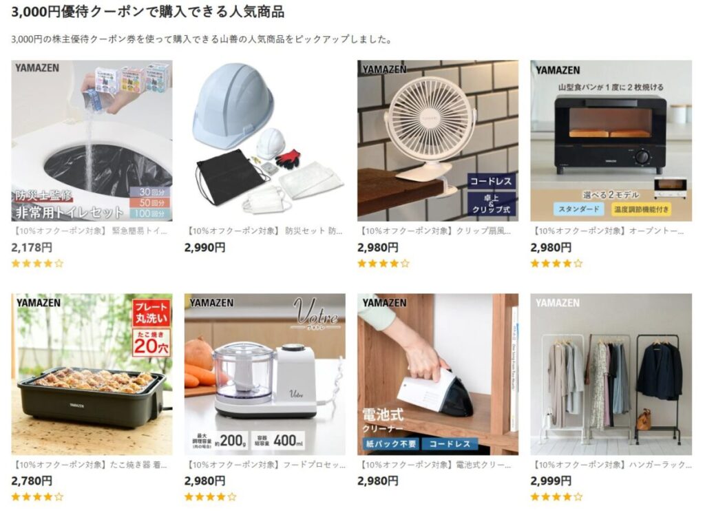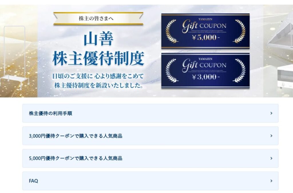 毎年3月権利で、自社通販サイト「山善ビズコム」の割引クーポン進呈。