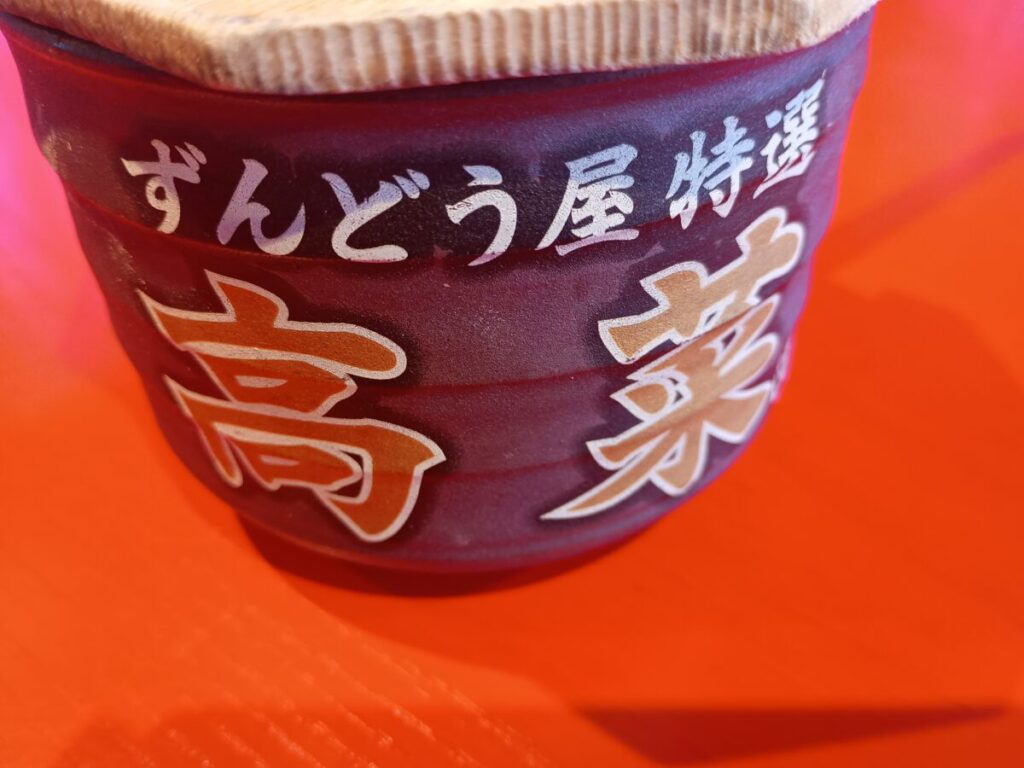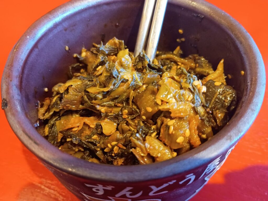 ずんどう屋では席に着くとどっさり高菜の入れ物がテーブルに置かれます。