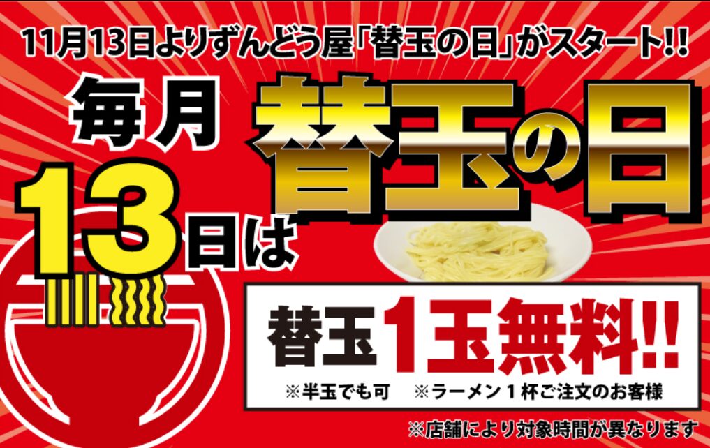 ずんどう屋は毎月13日が替玉無料の日。ラーメンを注文すると1玉無料で注文できますよ。