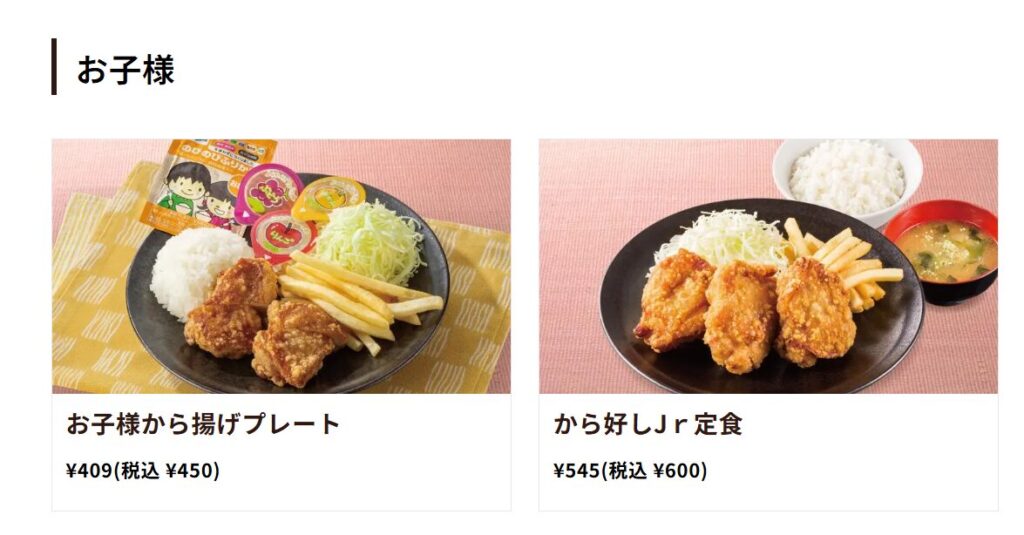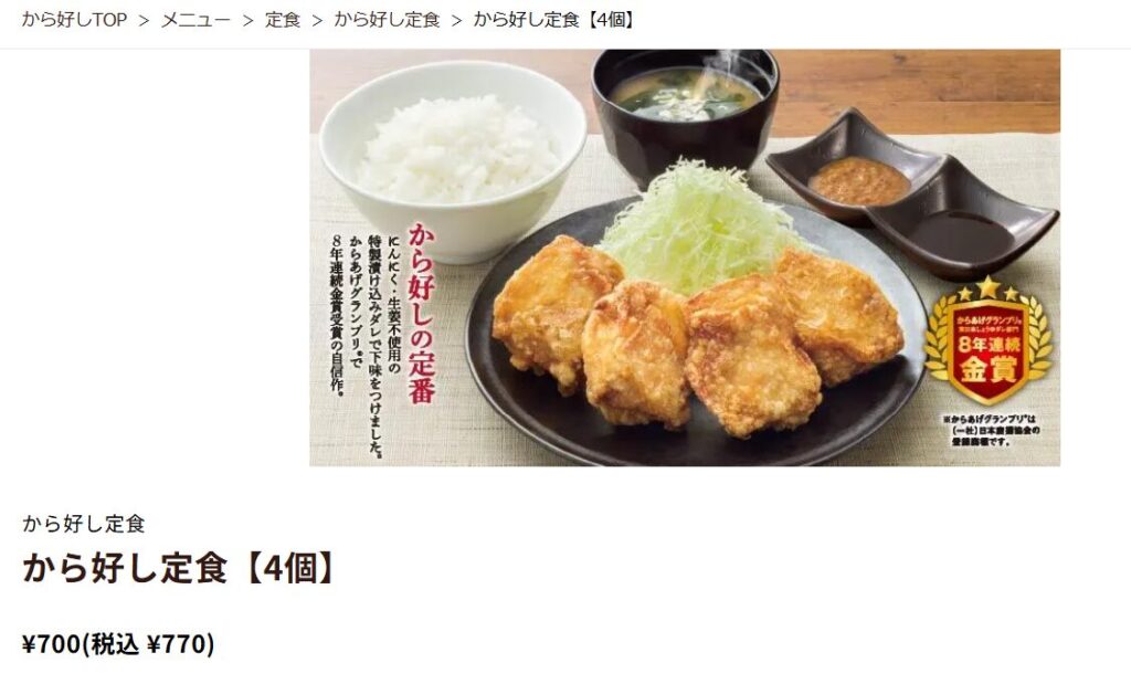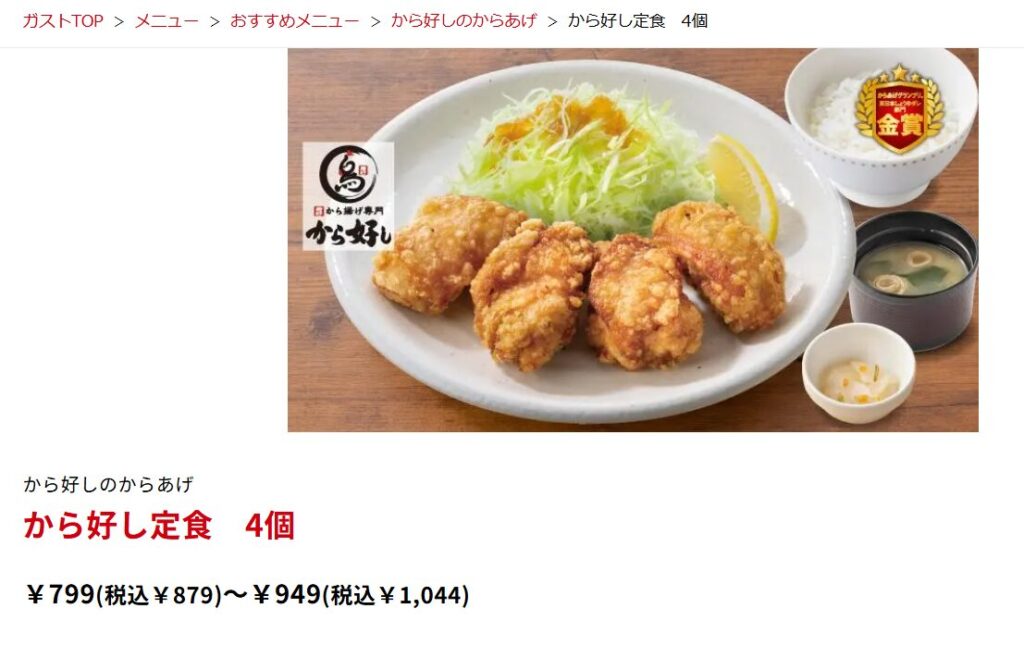 まず基本のから好し定食(から揚げ4個)の価格。ガストだと地域により本体879円~1,044円です。