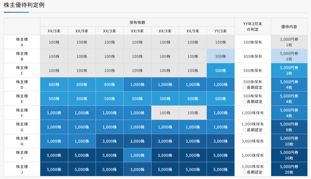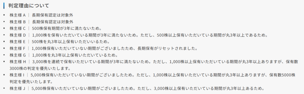 毎年9月末日および3月末日の株主名簿に記載されている保有株式数について、同一の株主番号で保有株数ランクの各規定株数(500株・1,000株・3,000株・5,000株・10,000株)を7回以上連続で保有していることが確認でき、かつ、それ以降最初の3月末日に継続して保有していただいている場合、それぞれの株数の長期保有と認定させていただきます。