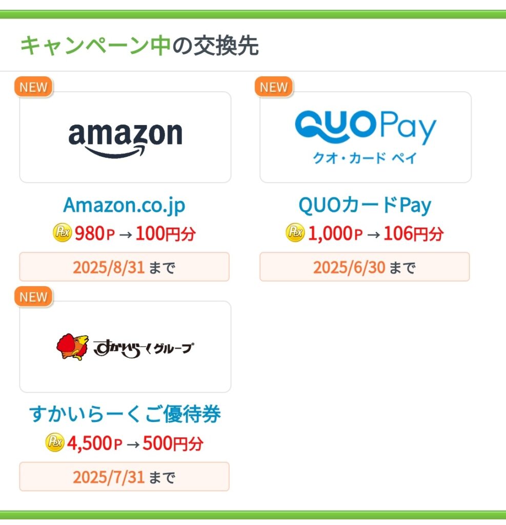 amazonギフトカード、クオカードペイ、PEXと交換可能。
