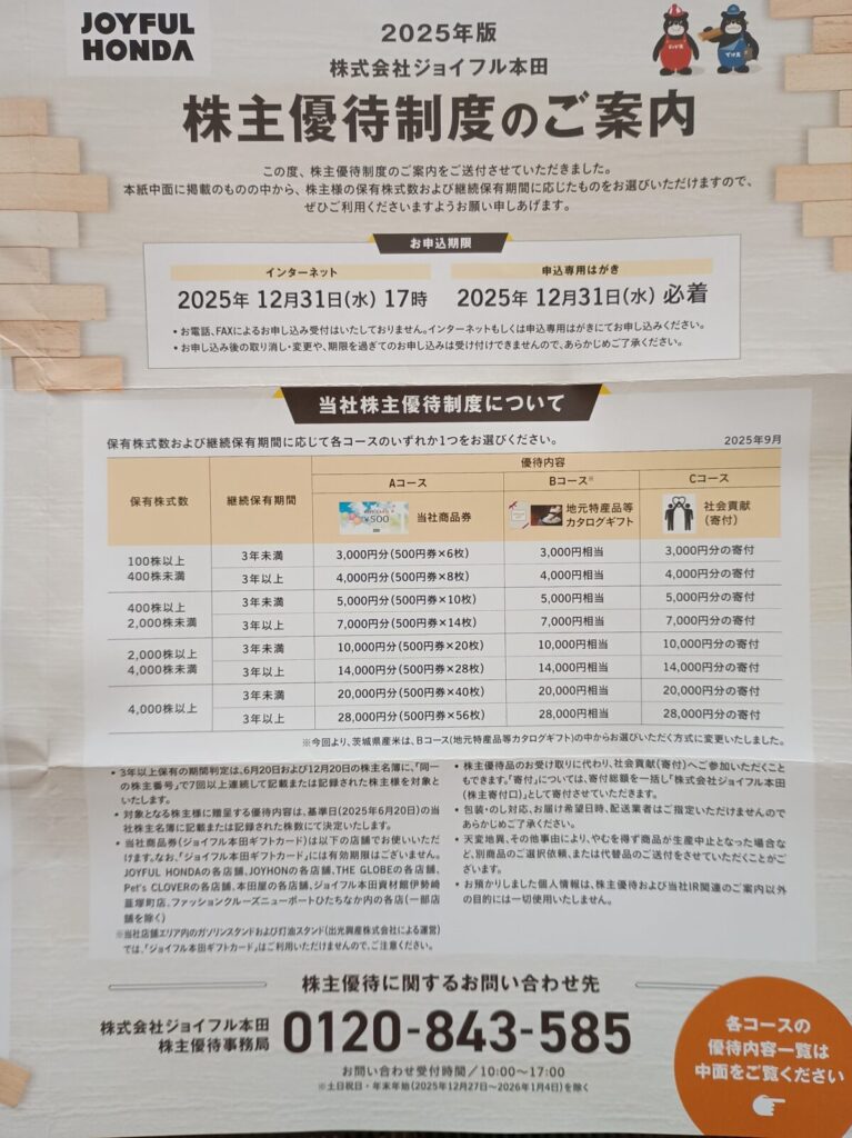 関東地方にホームセンターを展開するジョイフル本田(3191)から株主優待の案内が届きました。