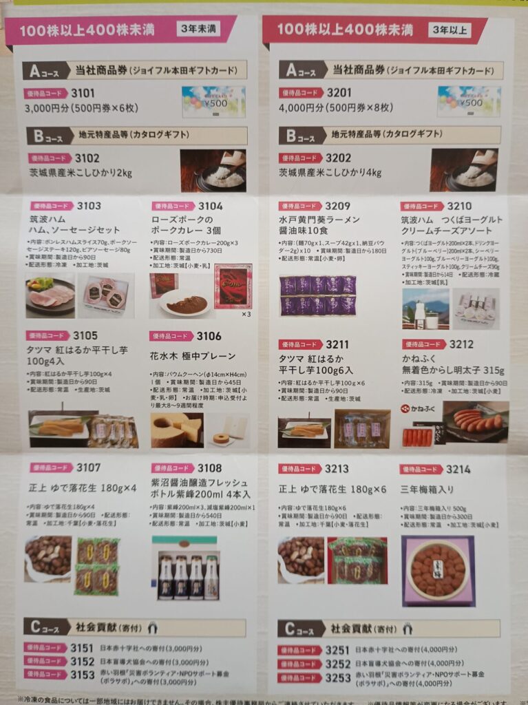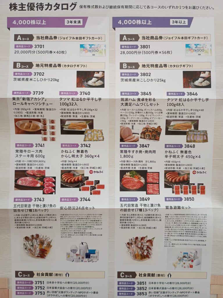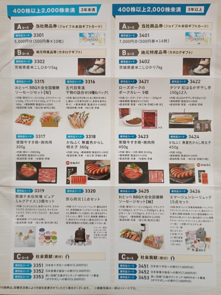 ジョイフル本田の優待は全区分共通で自社商品券、そして茨城県産こしひかりが選択できるようになっていますよ。