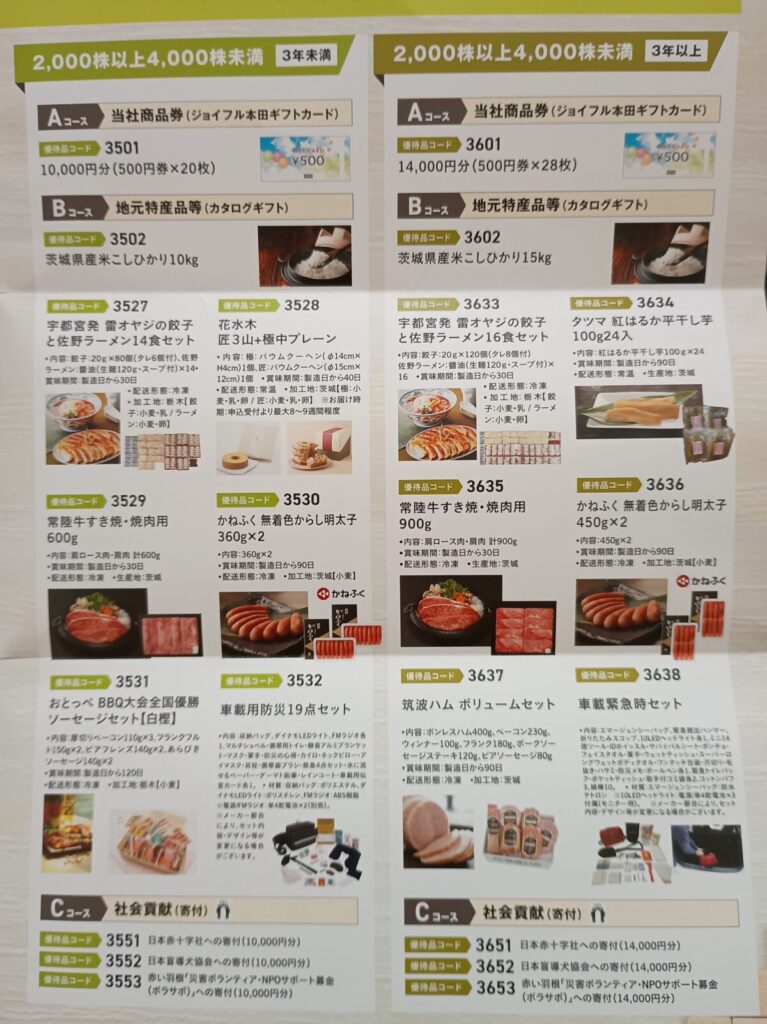 こちらには優待品、そして保有株数と年数に応じた優待品の金額が一覧となって記載されています。