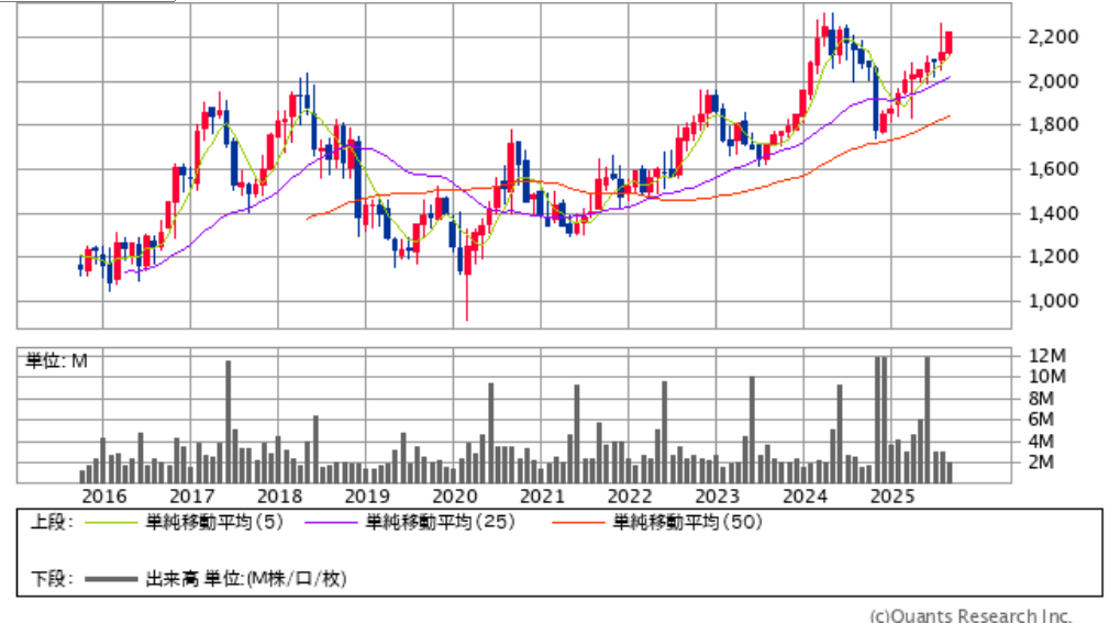 なお株価の方は直近の相場と同じく高値圏となっています。下の画像は10年チャートです。