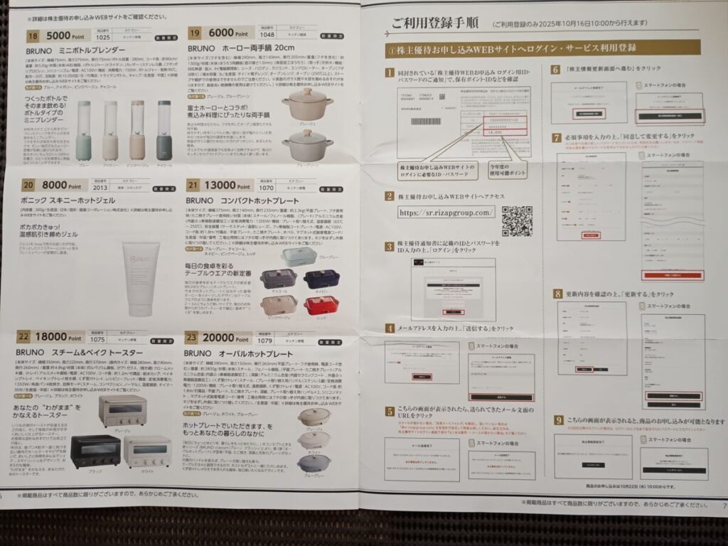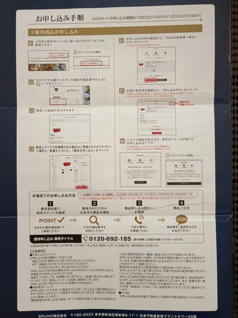BRUNOの優待案内はカタログと注文サイトのログインIDの紙でワンセットです。