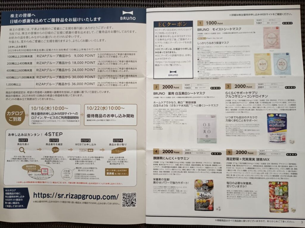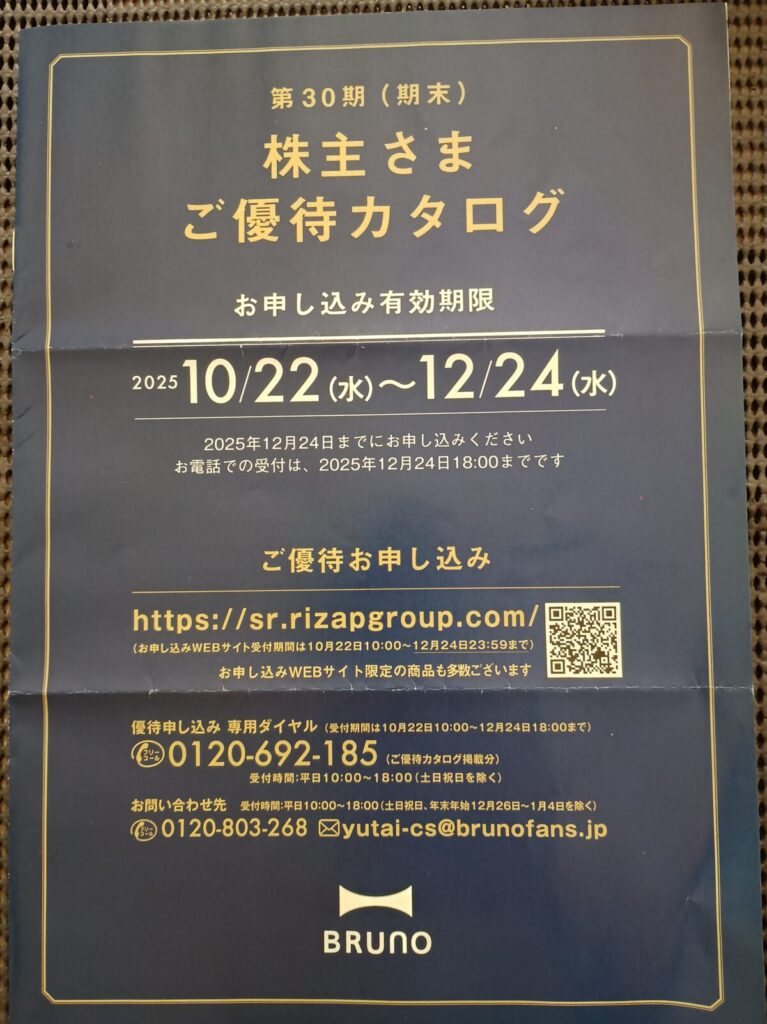 ライザップグループの一角、おしゃれな家電品などを取り扱うBRUNO(ブルーノ・3140)から株主優待の案内が到着しました。