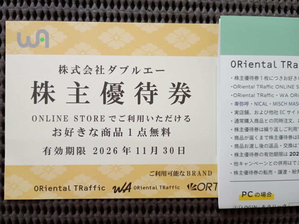 ダブルエーの優待はオリエンタルトラフィックの通販商品が何でも無料になるクーポンコードが付いた優待券です。