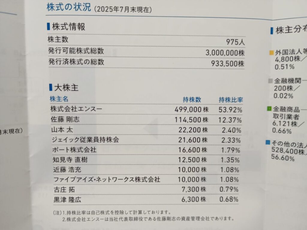 株主通信に記載された2025年7月末現在の株主数は975名。
