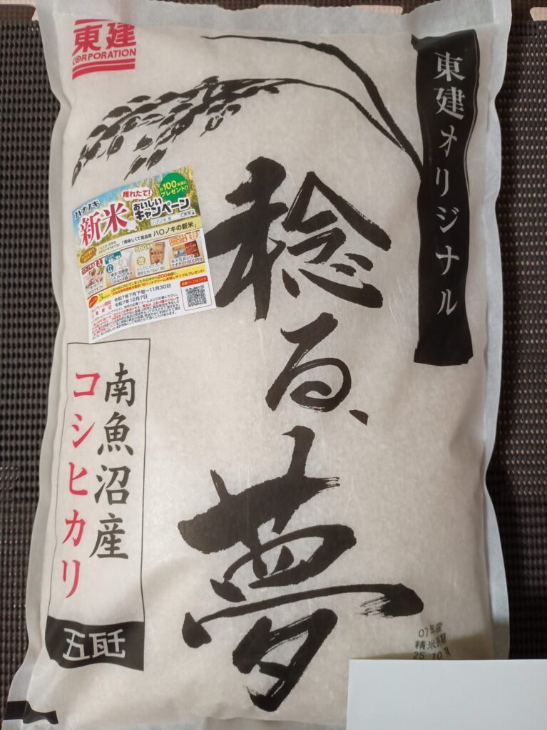 今回届いたのは東建コーポレーション(1766)の南魚沼産こしひかり。