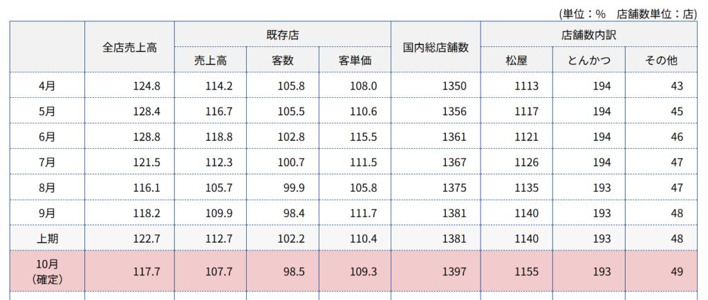ちなみに松屋はこんな感じ。既存店の客数前年比は98.5%とまだ健闘しています(この数字は松屋のみ)。
