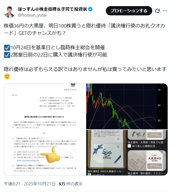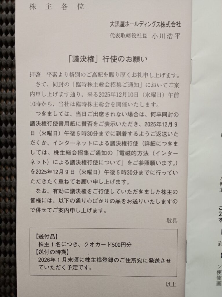 通常3月決算となっている大黒屋ホールディングス(6993)は、株主総会の議決権行使による隠れ優待で一部で有名です。