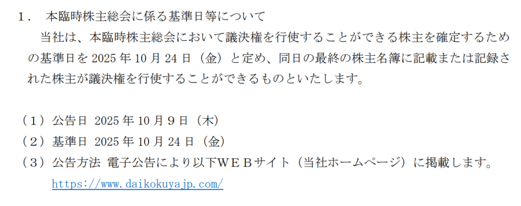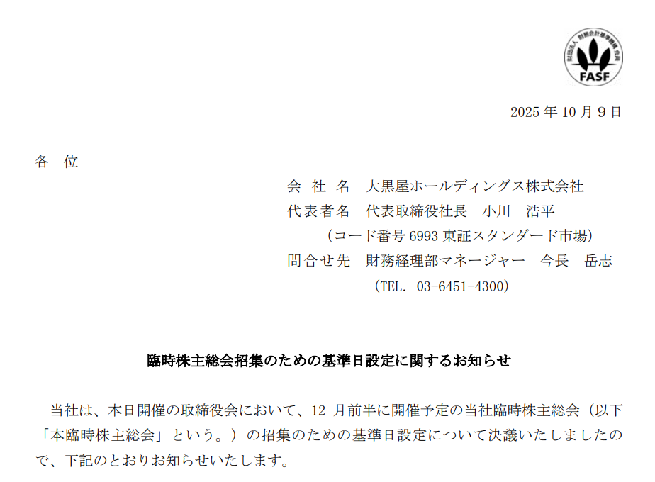 実は今回の臨時株主総会開催に関しては、10月9日の適時開示で出ていました。