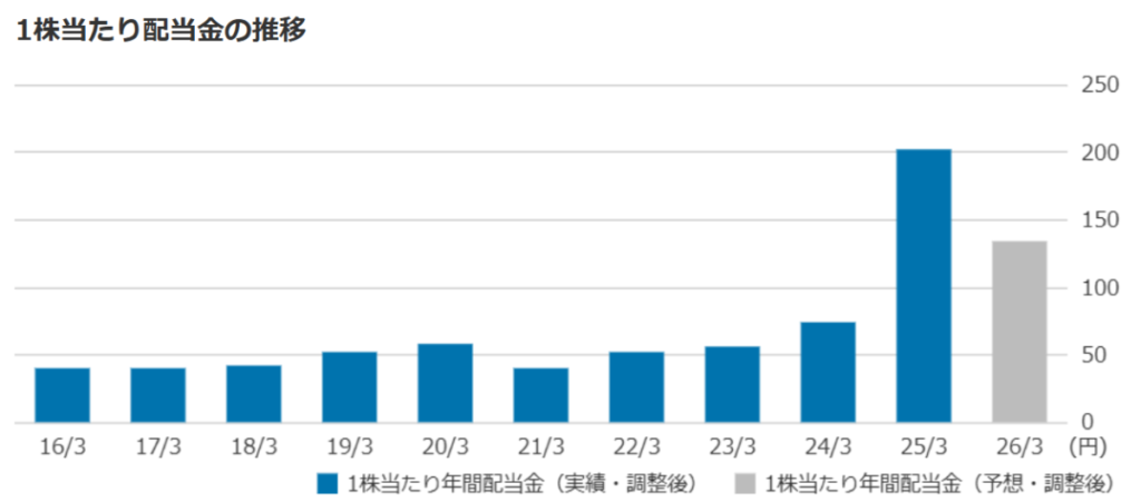 2025年3月期は記念配当が大きかったため26年3月期は減配となっていますが、普通配当の金額を見ると「76円⇒134円」と大幅に増額されています。