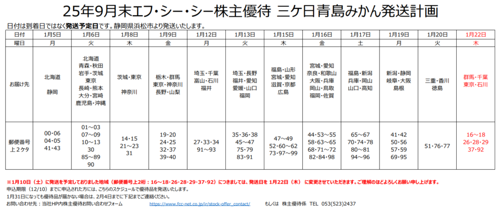 最速で1月5日の北海道と静岡。一番遅い方は1月22日発送の群馬・千葉・東京・石川。