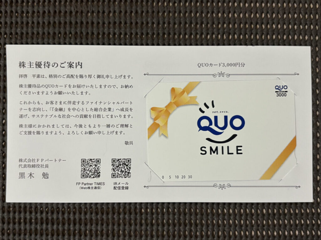 FPパートナーの優待は「毎年2回クオカード進呈」となっています。