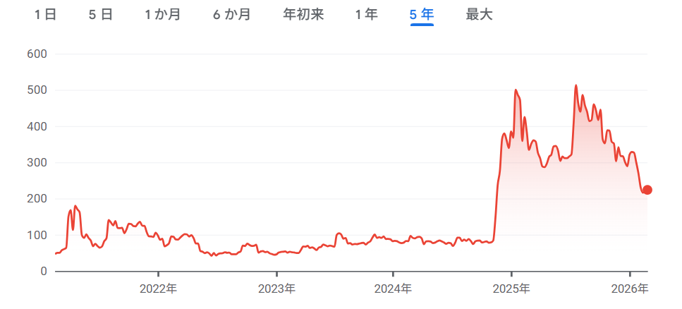 2025年の初旬と後半に高値を付けた後、年末以降右肩下がりになりつつありますね。