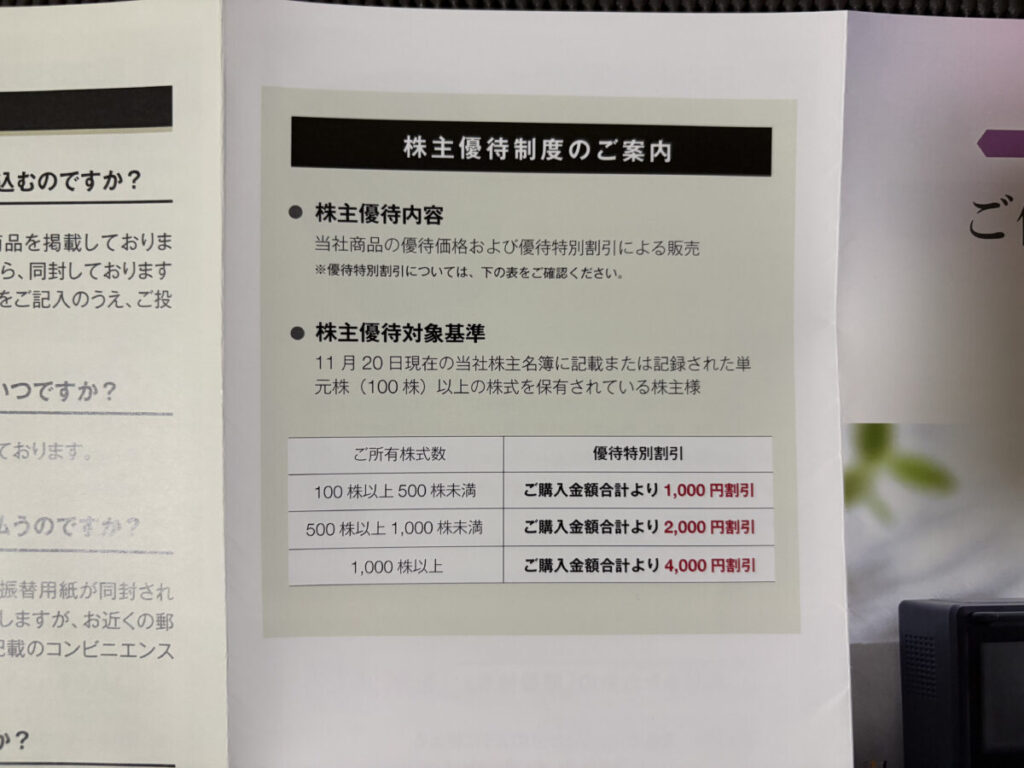 一番安い物が電気ケトルで4,500円。もし1,000株保有(4,000円引き)の場合、差額の500円で買える事になりますね。