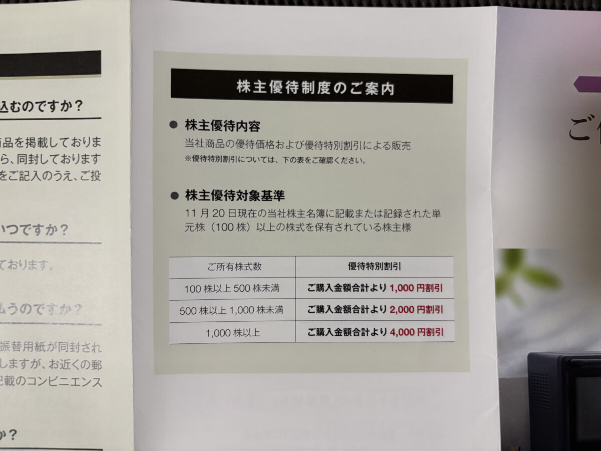 一番安い物が電気ケトルで4,500円。もし1,000株保有(4,000円引き)の場合、差額の500円で買える事になりますね。