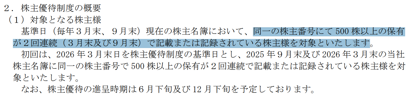 なお初回となる2026年3月権利においても半年以上の保有が必要なため、新設と同時に購入しても初回進呈は2026年9月からとなります。
