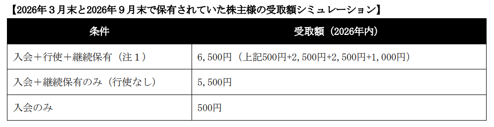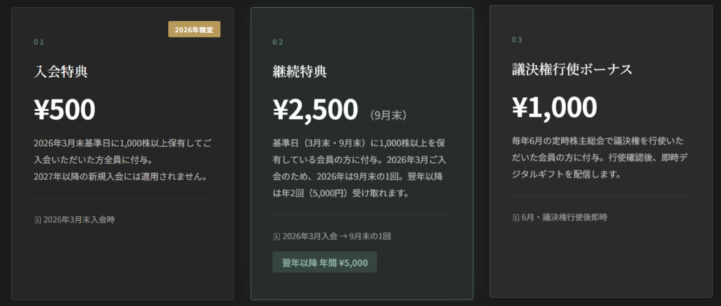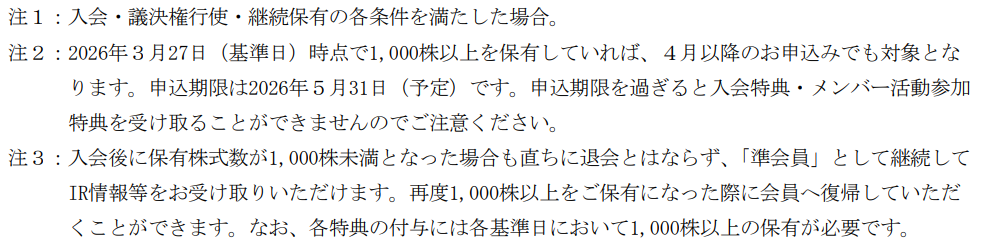 | 初回入会特典 | 500円 | 基準日時点で1000株以上保有し、期限までに入会手続きを完了した会員に付与 |