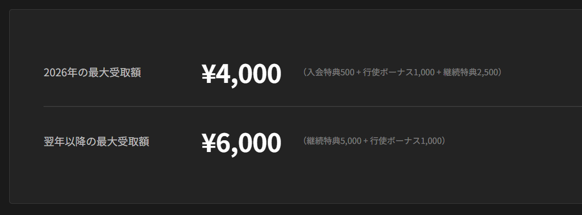 | 初回入会特典 | 500円 | 基準日時点で1000株以上保有し、期限までに入会手続きを完了した会員に付与 |