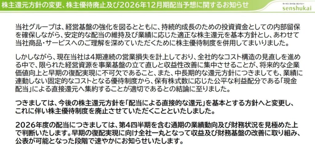 株主通信には「遺憾ながら無配とさせていただきます。株主の皆様には大変申し訳なく…」とありますが「株主優待を廃止してしまい申し訳ございません」と一言付け加えて欲しかったなぁ(泣)。