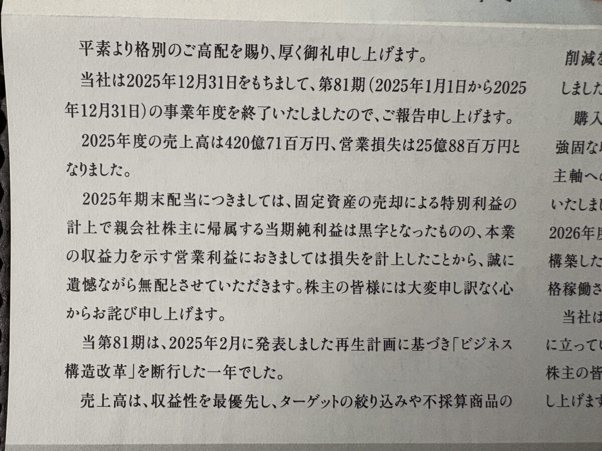 株主通信には「遺憾ながら無配とさせていただきます。株主の皆様には大変申し訳なく…」とありますが「株主優待を廃止してしまい申し訳ございません」と一言付け加えて欲しかったなぁ(泣)。