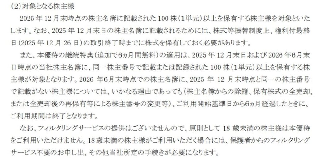その代わり、12月権利を通過後、引き続き6月権利でも100株以上保有していれば更に半年延長という内容に変更されました。